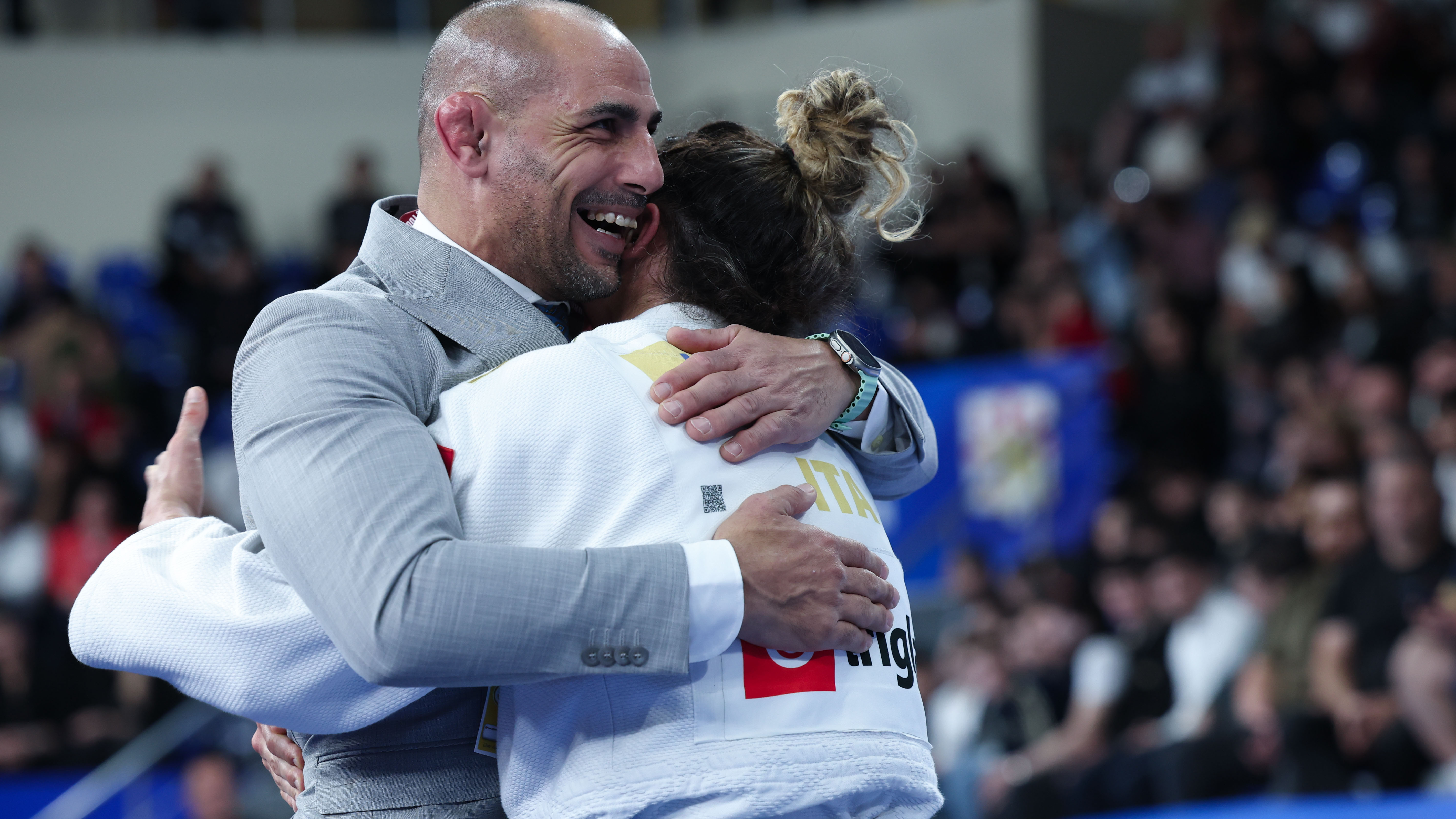Alice Bellandi et son entraîneur Antonio Ciano célèbrent une victoire européenne. © EJU