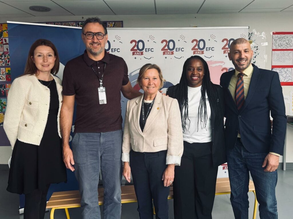 De gauche à droite : Alevtina Ziacas, Directrice du département international ; Sébastien Nolesini, Directeur Général de la Fédération Française de Judo ; Kristiina Pekkola, Vice-Présidente de l’EJU ; Gevrise Emane, Directrice de l’Éducation de l’EJU et Kamel Yassili, Directeur de l’École Française.